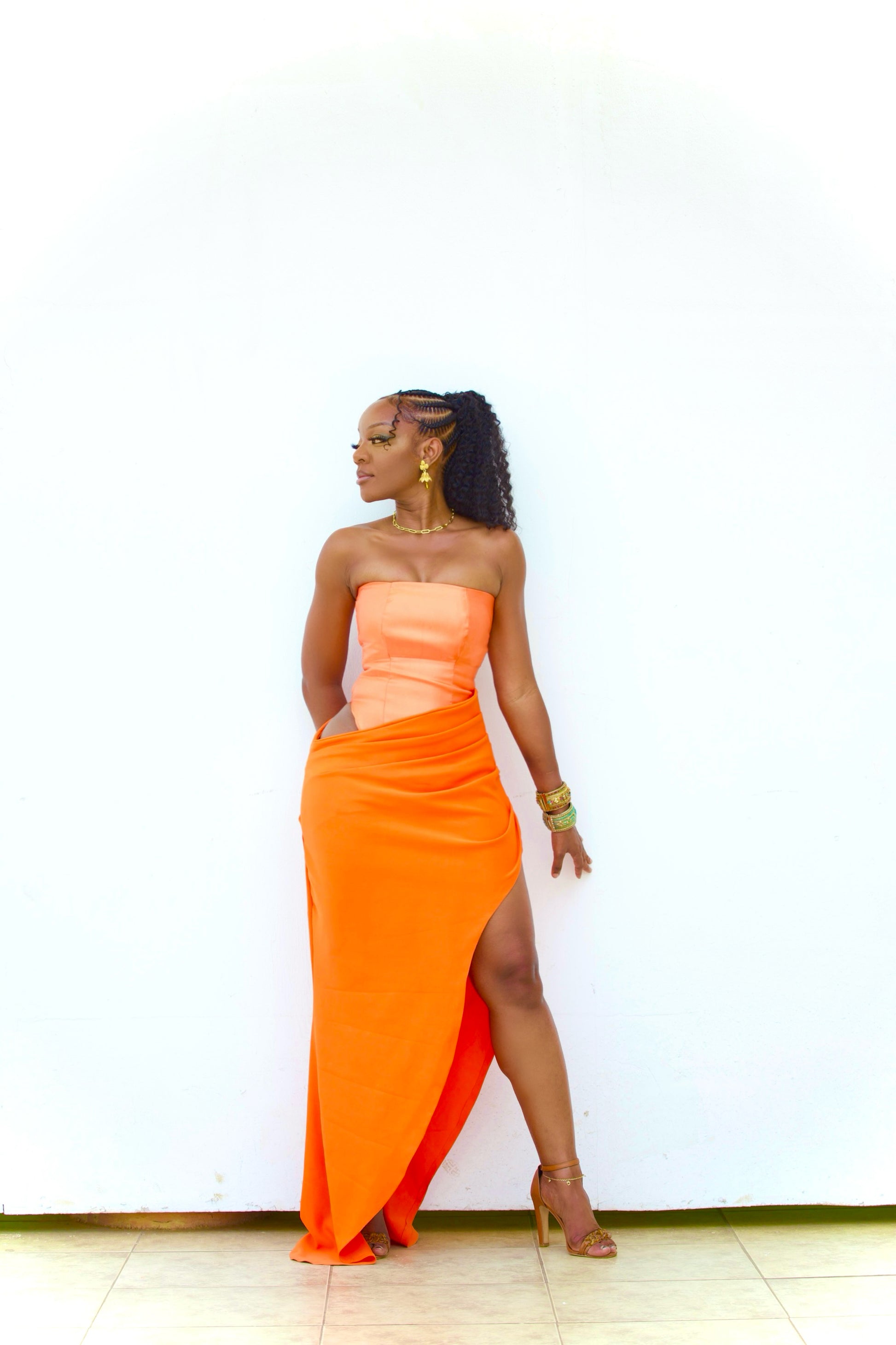 Draped in molten orange, this strapless stunner hugs in all the right places, with an iridescent corset top (click here to see) that cinches the waist and a high-slit wrap skirt that moves with you. Whether you’re making an entrance at a summer wedding or sipping cocktails at sunset, Ember brings the heat.