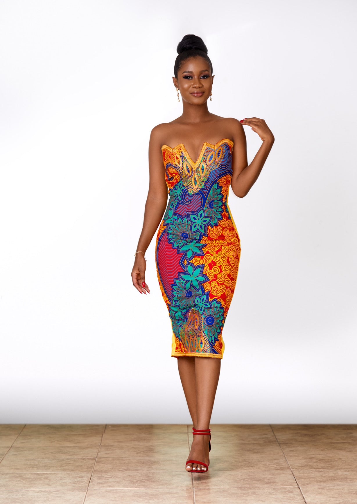 Every fabric pattern in Ghana’s markets earns a name; this one was called Java. Originally designed with sleeves, it evolved into a clean, strapless silhouette with a yellow stretch back for ease and comfort, finished with flame inspired hand embroidery at the neckline and a zipper in the back.