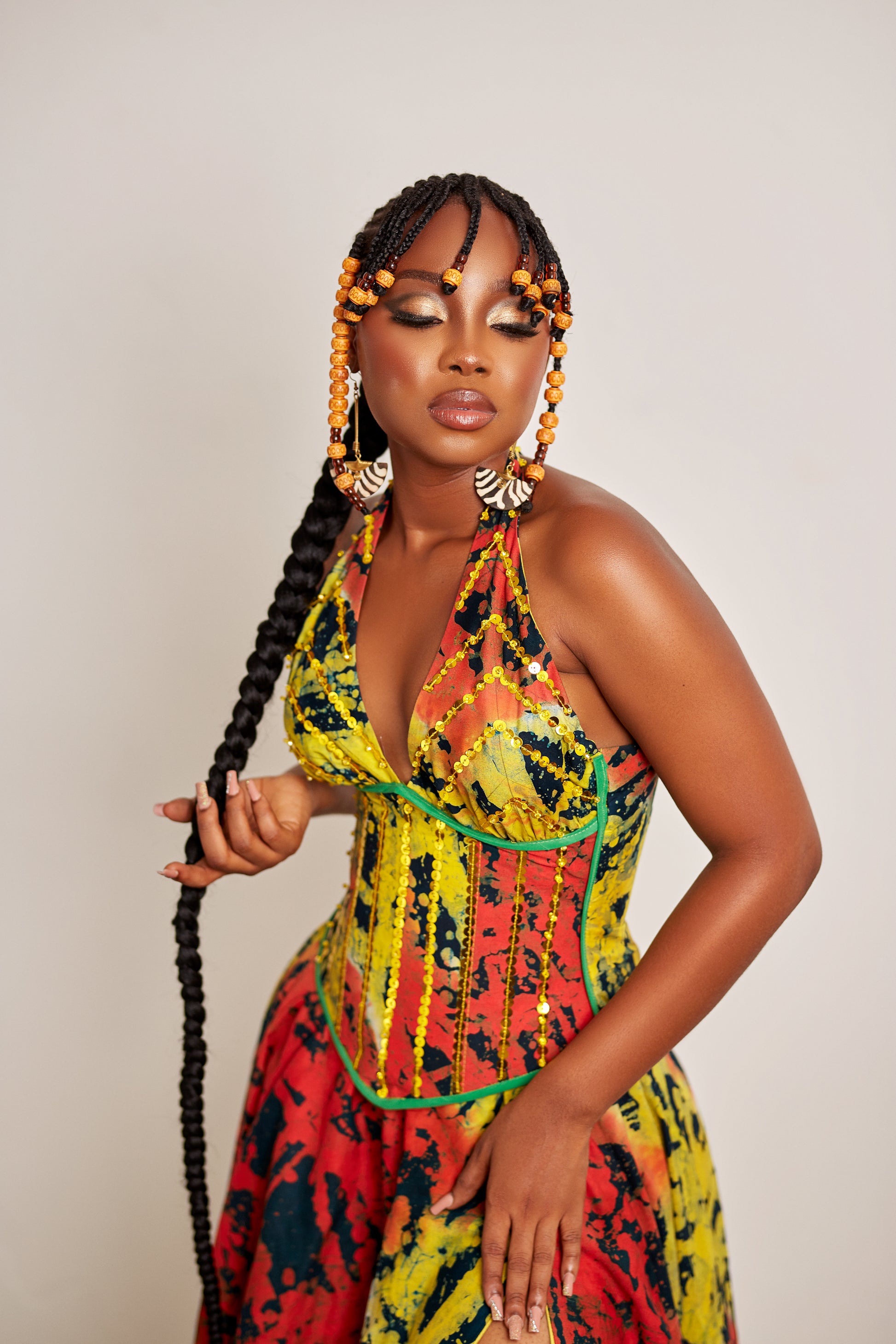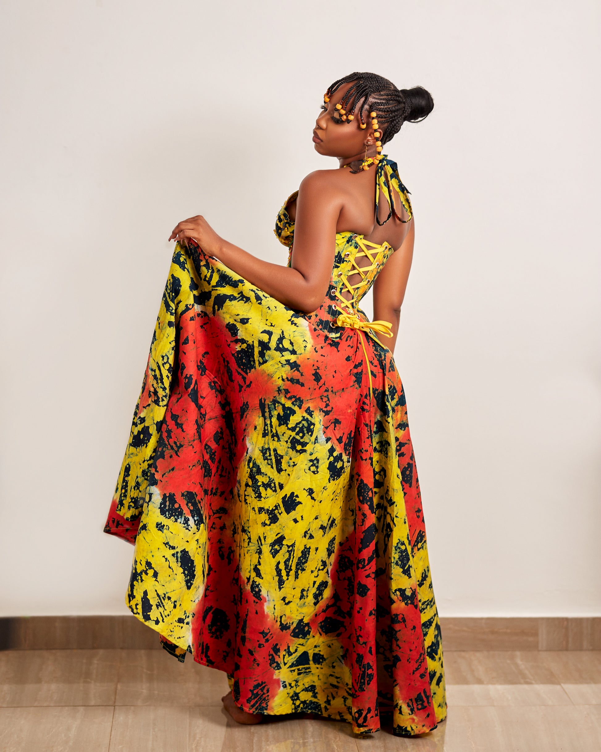The Kite Batik Maxi is a halter-neck corset and skirt set, crafted to resemble a flowing dress. Cut in a striking silhouette — cinched at the waist, flared at the hem — it’s made from warm-toned handmade batik and adorned with subtle sequin details. The adjustable slit offers ease and allure, while the structure brings balance to its fluid movement.
